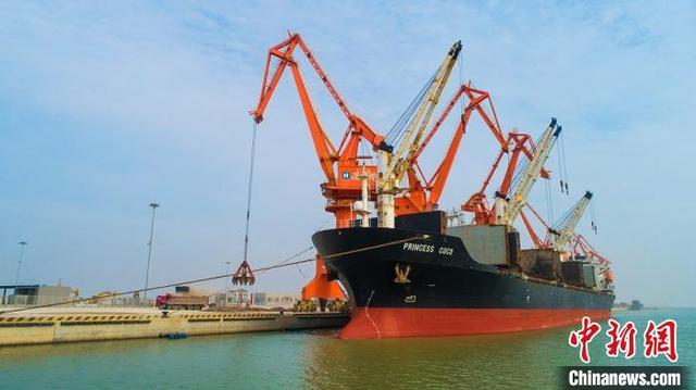 1日上午,靠泊在江蘇鹽城港濱海港區(qū)通用碼頭、滿載著從印度尼西亞進(jìn)口的兩萬噸鎳鐵的利比里亞籍貨輪緊張有序地進(jìn)行卸貨作業(yè)。這是鹽城港濱海港區(qū)一類口岸正式對外開放后迎來的首艘外貿(mào)貨輪。