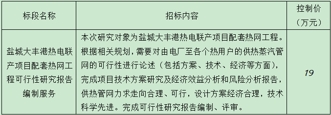 鹽城大豐港熱電聯產項目配套熱網工程可行性研究報告編制服務已經相關部門批準實施, 項目所需資金來源自籌已落實?,F決定對該項目進行公開招標,擇優選定承包人。