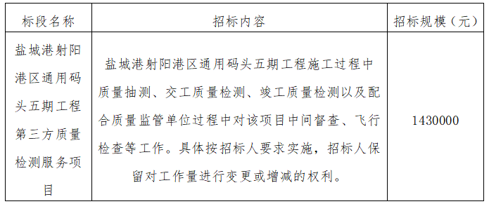 ⑴項(xiàng)目名稱:鹽城港射陽港區(qū)通用碼頭五期工程第三方質(zhì)量檢測服務(wù)項(xiàng)目?