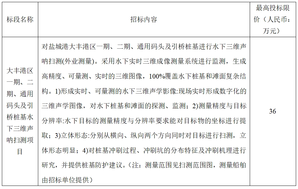 (5)項目標段劃分:大豐港區一期、二期、通用碼頭及引橋樁基水下三維聲吶掃測項目共劃分1個標段,標段信息如下: