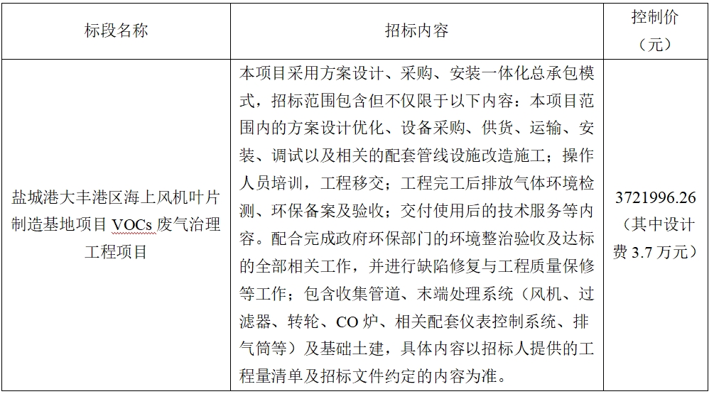 (5)項目標段劃分:鹽城港大豐港區海上風機葉片制造基地項目VOCs廢氣治理工程項目共劃分1個標段,標段信息如下: