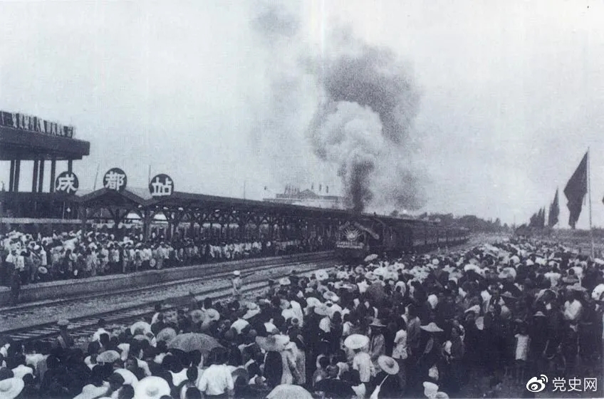 新中國成立后,在短短的兩年內就建成了成渝鐵路。圖為1952年7月1日由成都開出的第一列火車。