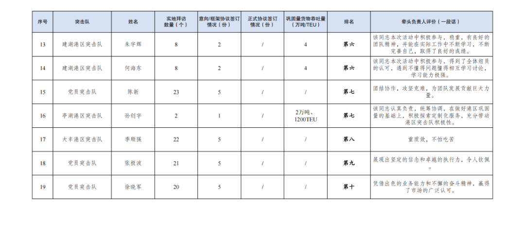 1.累計拜訪客戶數量397家:其中大豐港區突擊隊143家,巾幗突擊隊54家,響水港區突擊隊48家,射陽港區突擊隊26家,黨員突擊隊23家,航運集團突擊隊20家,濱海港區突擊隊19家,亭湖港區突擊隊18家,建湖港區突擊隊18家,阜寧港區突擊隊13家,多式聯運第一突擊隊10家,多式聯運第二突擊隊4家,青年突擊隊1家。