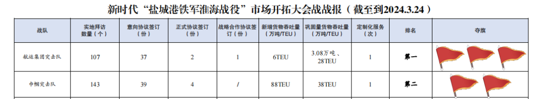 自新時(shí)代“鹽城港鐵軍淮海戰(zhàn)役”市場開拓大會(huì)戰(zhàn)開展以來,航運(yùn)集團(tuán)積極響應(yīng)鹽城港集團(tuán)黨委號(hào)召,成立航運(yùn)集團(tuán)突擊隊(duì)和巾幗突擊隊(duì),持續(xù)深化攬貨拓源,大力弘揚(yáng)“鐵軍精神”,成功實(shí)現(xiàn)市場開拓“新突破”,將定制化、兜底式服務(wù)推向了“新高度”。截至目前,累計(jì)拜訪客戶308家,簽訂意向協(xié)議97份,簽訂正式協(xié)議8份,實(shí)現(xiàn)新增營收超100萬元,集裝箱走量1008TEU。根據(jù)新時(shí)代“鹽城港鐵軍淮海戰(zhàn)役”指揮部第二期戰(zhàn)報(bào),航運(yùn)集團(tuán)包攬集體前兩名,個(gè)人前三名,全力打響“鹽城港鐵軍淮海戰(zhàn)役”市場開拓大會(huì)戰(zhàn)第一槍。