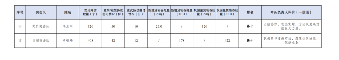 第一名:大豐港區(qū)突擊隊(duì) 夏迎冬(拜訪客戶432家,簽訂意向協(xié)議279份,簽訂正式協(xié)議25份,新增貨物吞吐量86.4萬噸,鞏固量貨物吞吐量33.2萬噸);