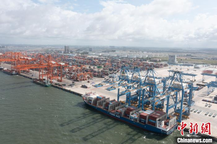 圖為航拍廣西北部灣港欽州自動化集裝箱碼頭。王偉臣 攝