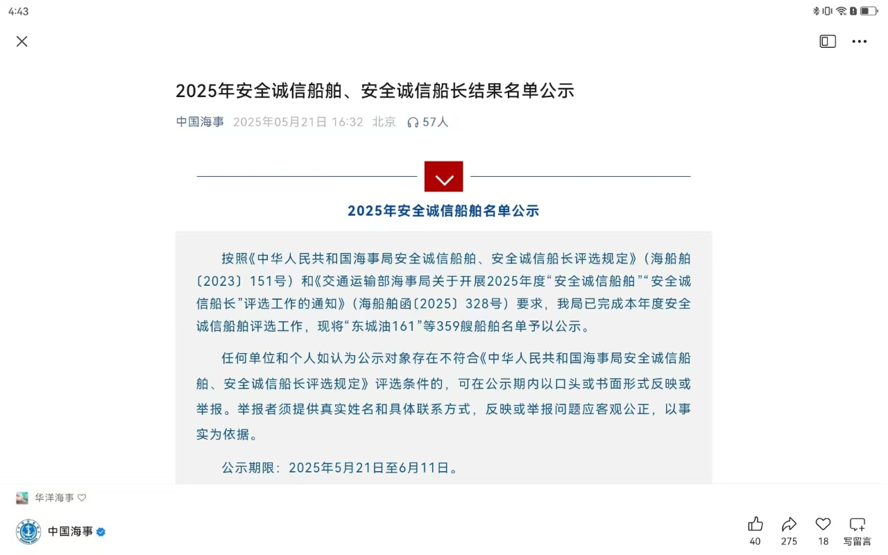 5月21日,中華人民共和國海事局公布2025年安全誠信船舶評選名單,江蘇大豐港海融海運有限公司所屬的鹽城籍“大豐港海融”輪榜上有名。這是該船連續(xù)第二次獲評“安全誠信船舶”,成為鹽城籍船舶歷史性“第一”。