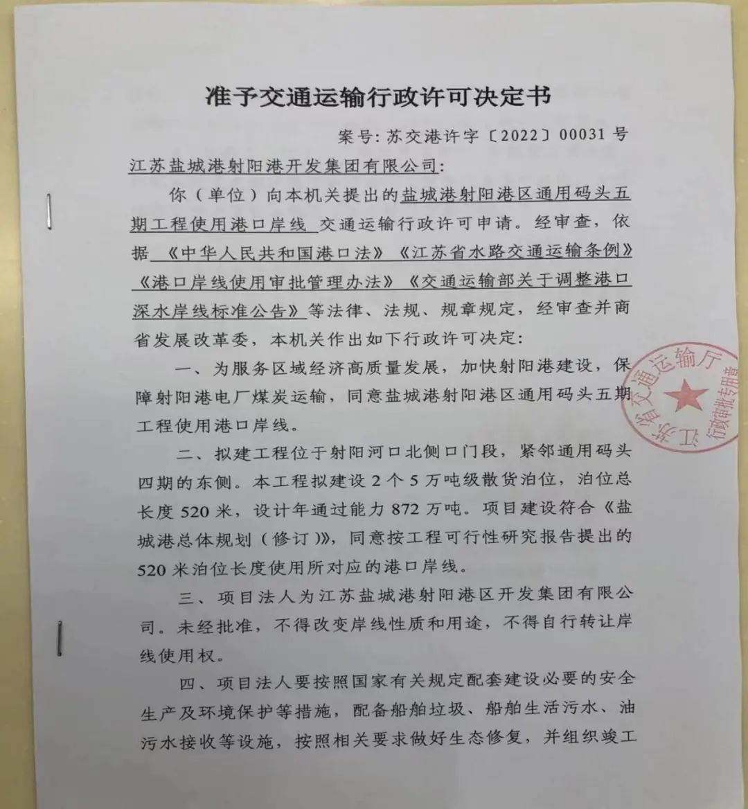 【項目大推進】鹽城港射陽港區通用碼頭五期工程岸線獲批