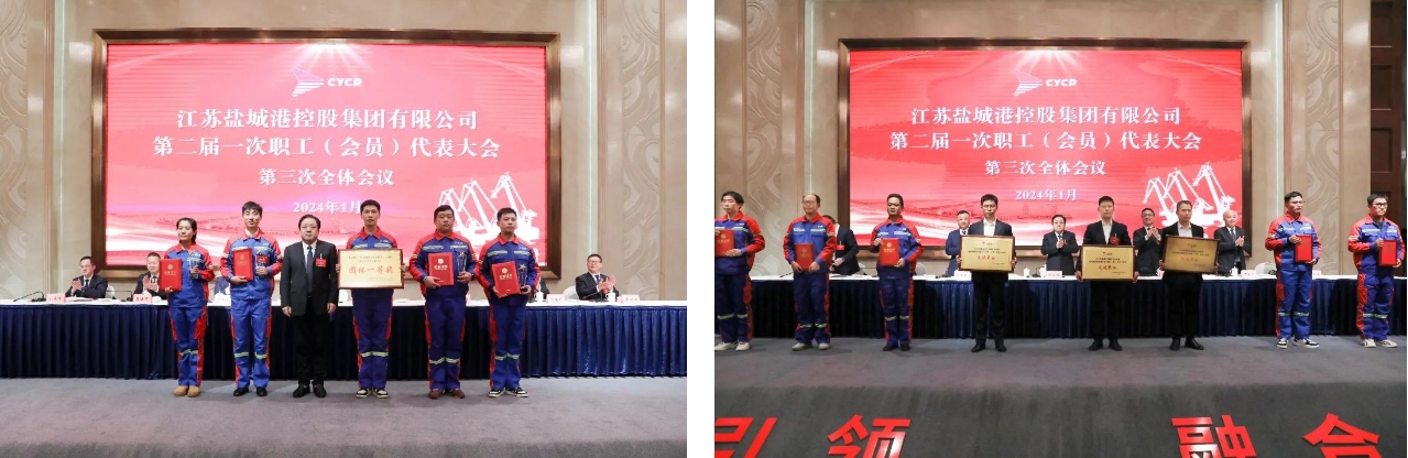 會議現場為榮獲2023年市技能競賽先進集體、“鹽城市五一創新能手”先進個人、首屆長江港口門式起重機集裝箱岸邊吊操作工職業技能競賽團體一等獎、中華全國總工會“云宣講”達人的單位及個人頒獎。