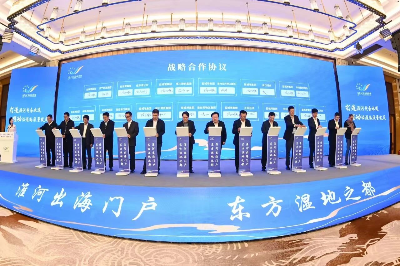 會議發布了《打造淮河黃金水道 推動沿淮高質量發展鹽城倡議》和《淮河流域港航協作發展規劃研究報告》?!冻h》提出,將全面推進《淮河生態經濟帶發展規劃》實施,深化淮河流域城市群共建淮河黃金水道、共促產業轉型升級、共謀綠色低碳發展、共繪美麗生態圖景,共同推動沿淮高質量發展?!秷蟾妗诽岢觯瑢嫿ㄒ喳}城港淮河生態經濟帶出海門戶港為核心,淮河、京杭運河兩大淮河流域主通道為主軸,形成承東啟西、南北互濟,多港口深度互聯合作的“一核、兩軸、四向、多點”的淮河流域港航發展總體空間格局。