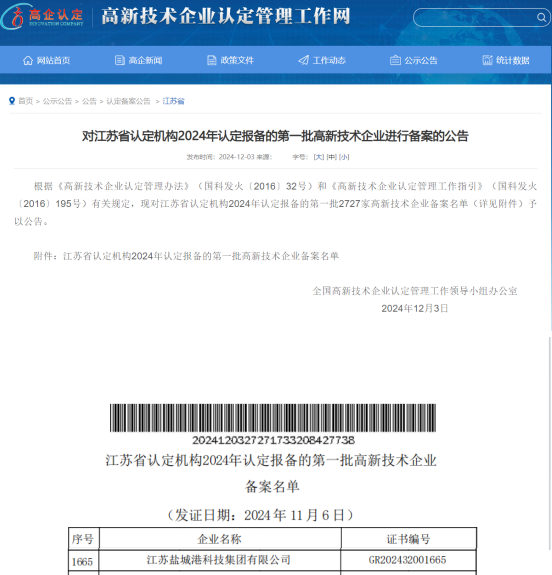 12月3日,鹽城港科技集團成功通過“高新技術企業”認定,提前一年完成國家高新技術企業認定的既定目標,標志著鹽城港集團科技創新工作實現重大突破,邁入轉型升級新階段。