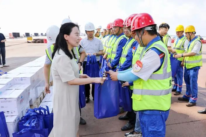 活動(dòng)現(xiàn)場(chǎng),袁欣與大家親切交談,詳細(xì)詢問(wèn)一線職工的工作狀態(tài)和實(shí)際需求,對(duì)他們頂烈日、戰(zhàn)酷暑,始終堅(jiān)守崗位的敬業(yè)精神表示衷心感謝,叮囑他們要注意防暑降溫,做好個(gè)人防護(hù),并將防暑降溫“清涼禮包”送到職工代表手上。她說(shuō),當(dāng)前高溫、惡劣天氣逐漸增多,各單位要切實(shí)做好夏季防暑降溫工作,動(dòng)態(tài)調(diào)整作業(yè)時(shí)間,為廣大員工提供清涼舒心的休息場(chǎng)所,全面保障人身安全。同時(shí),要時(shí)刻繃緊安全這根弦,聚焦生產(chǎn)、消防重點(diǎn)領(lǐng)域,常態(tài)化開(kāi)展安全隱患排查治理工作,做好值班值守和應(yīng)急處置,確保港區(qū)安全生產(chǎn)形勢(shì)穩(wěn)定。