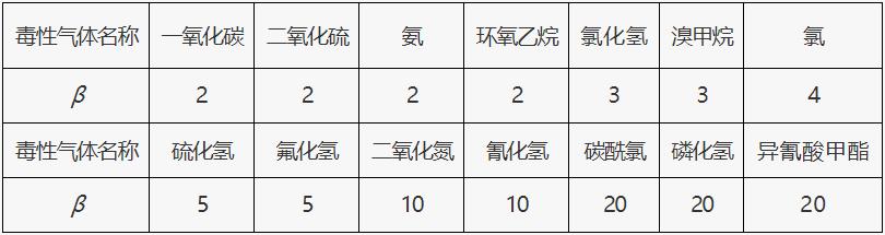 表1 常見毒性氣體校正系數(shù)β值取值表