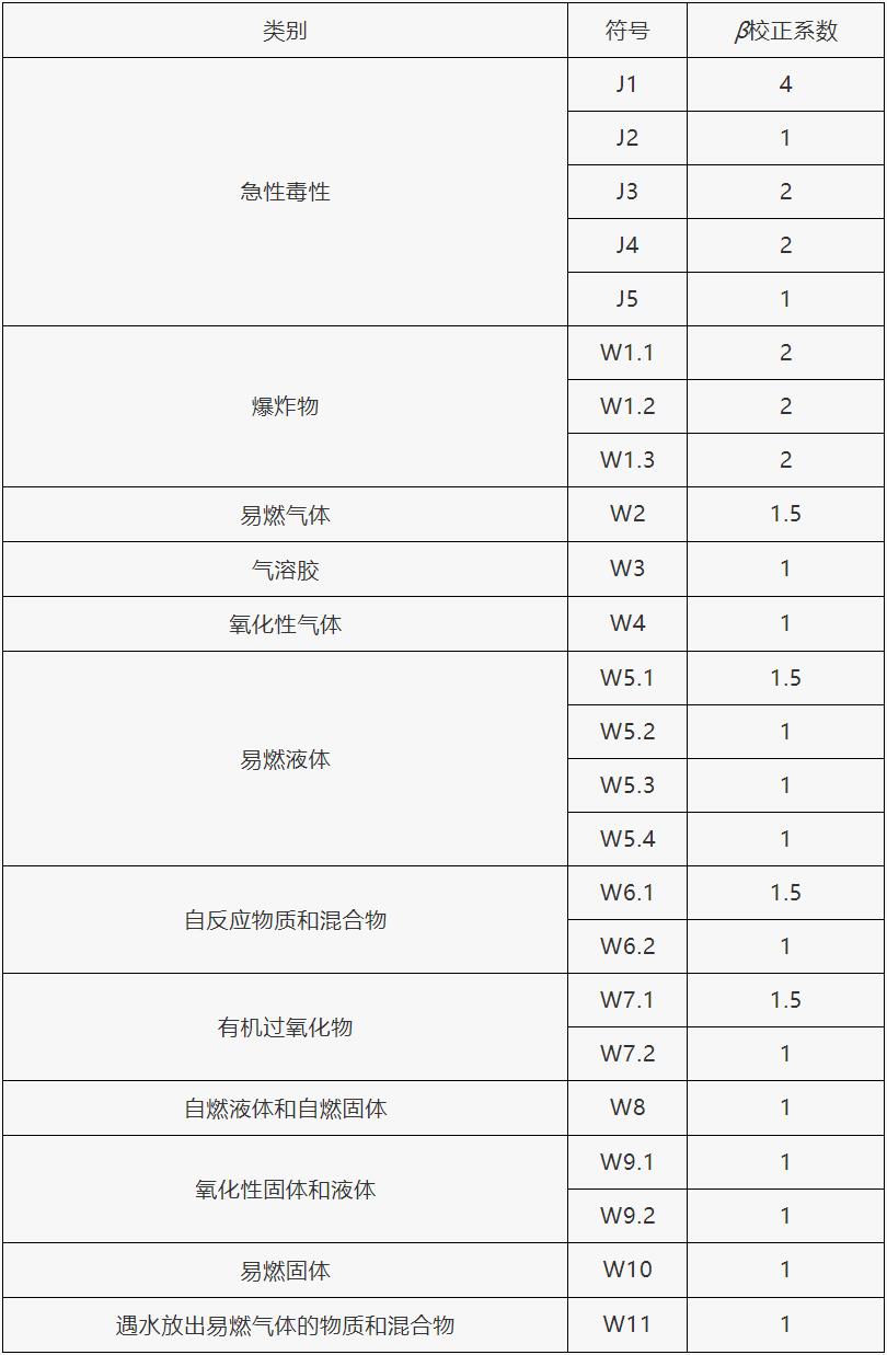 根據(jù)單元內危險貨物的類別不同,設定校正系數(shù)(β)值,在表1范圍內的危險貨物,其β值按表1確定,未在表1范圍內的危險貨物,其β值按表2確定。