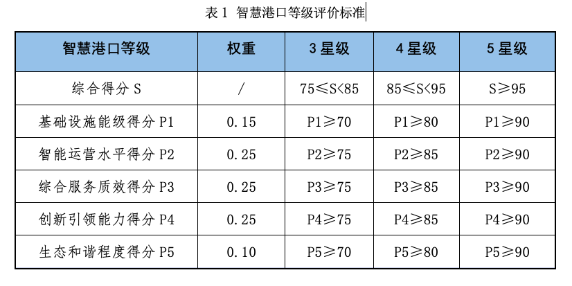 特別是近年來,大數據、物聯網、5G、北斗、AI等高新技術蓬勃發展。以現代科技元素賦予傳統港口新力量,港口數字化、智能化、智慧化進程加速推進。不斷成熟的技術和拓展的需求,也給我國智慧港口建設按下了發展的“加速鍵”。在此背景下,建立科學權威的智慧港口等級評價指標體系與方法,更好地引導我國智慧港口高質量發展十分重要。