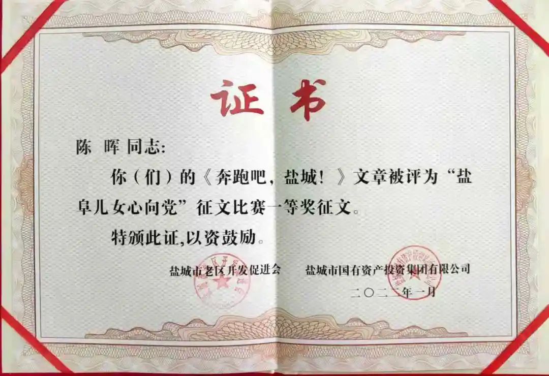 1月19日,由鹽城市老區開發促進會、鹽城市國有資產投資投資集團有限公司主辦的“鹽阜兒女心向黨”征文評審表彰會議在鹽城隆重舉行,江蘇響水港港務有限公司財務部副經理陳暉的《奔跑吧,鹽城!》作品在298篇文章中脫穎而出,榮獲一等獎。