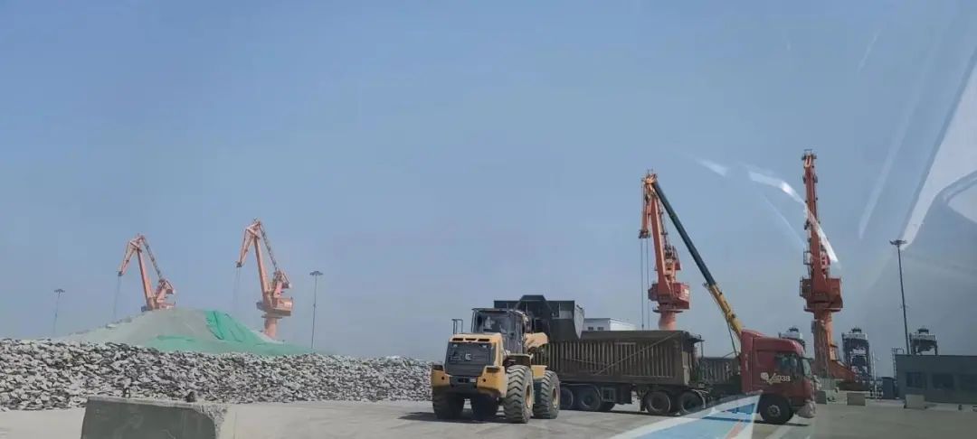 碼頭上,車來車往,裝船卸船,一片繁忙。一線員工們各司其職,熟練地操作著機械設備,現場作業井然有序。