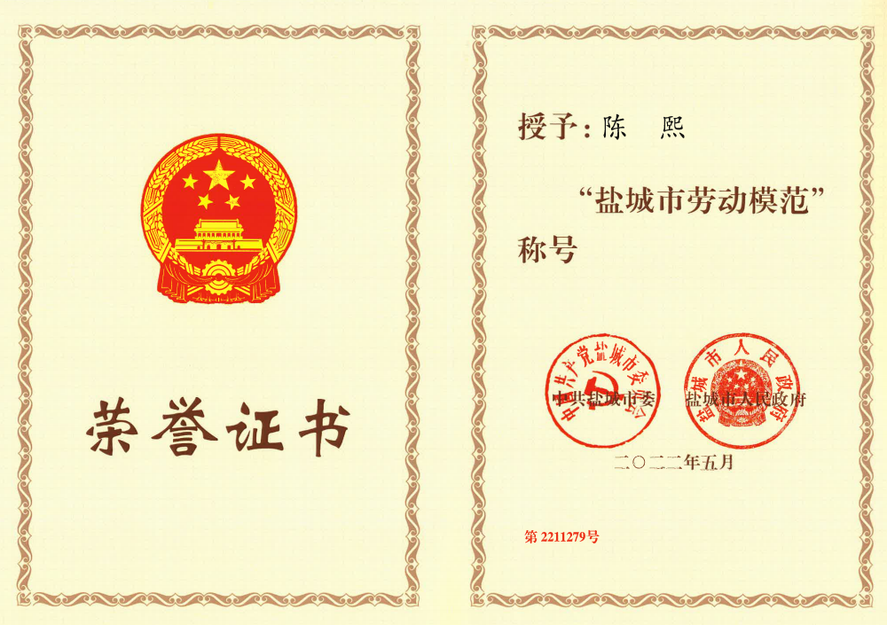 近日,市委市政府發布關于表揚鹽城市勞動模范的決定,集團射陽港區陳熙同志榮獲“鹽城市勞動模范”稱號。