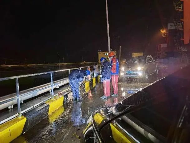 為了保障滾裝作業順利完成,糧食碼頭分公司檢修人員以車燈為照明,冒著大風大雨檢修線路。