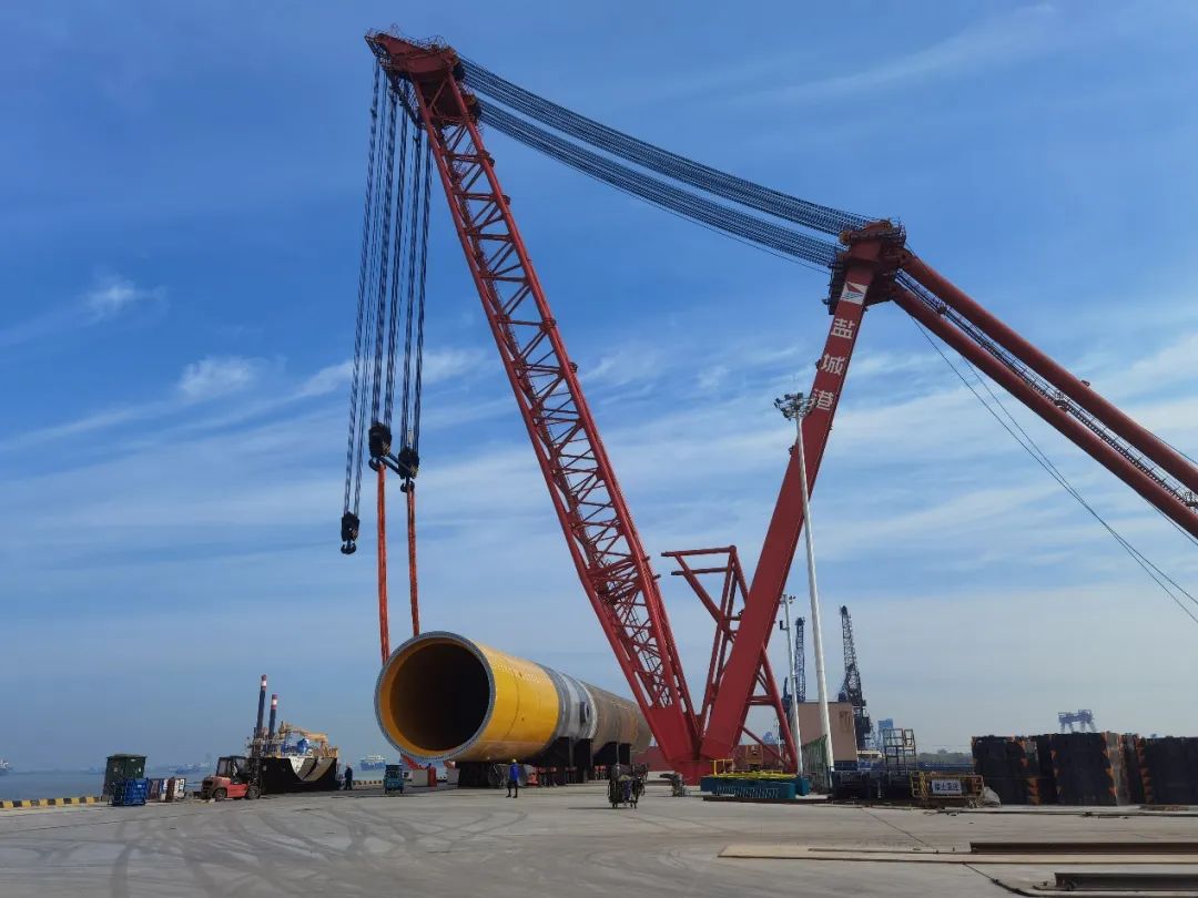 5月28日,鹽城港響水港區小蟒牛作業區公用重件碼頭現場一派繁忙景象,由公用重件碼頭后方陸域打砂除銹噴涂并進行拼接組裝的首件風電樁基,通過自行模塊車運輸至碼頭前沿。該件總長75米、直徑8米、總重達1055.1噸,由1100t-51m巨無霸固定桅桿吊穩穩吊起,緩緩地放置在駁船擱置梁上,出海駛向渤海風電建設現場。