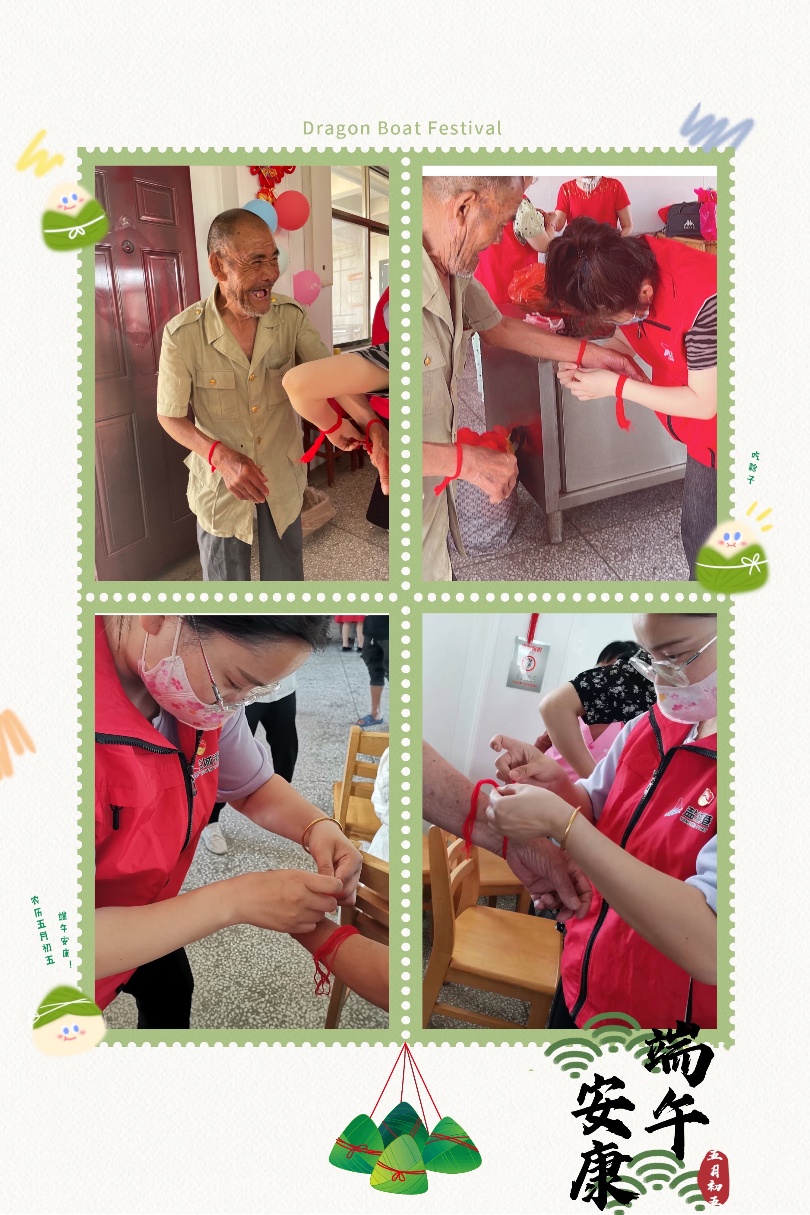 粽子飄香,絲線傳情。志愿者們為現場老人系紅線送祝福。老人們開心的像個小大孩,爭相比著自己的紅線繩,現場一片歡聲笑語。“一年一端午,一歲一安康,艾葉飄香,紅線捆扎,串起港城間的和諧幸福”。