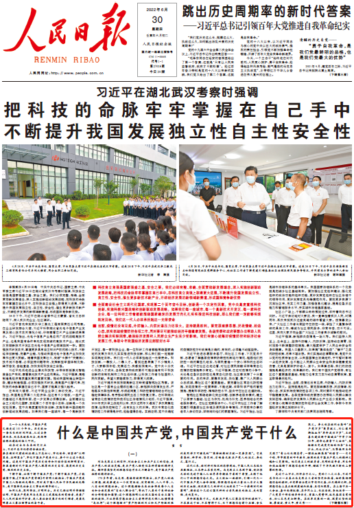 6月30日,人民日報頭版刊發“宣言”署名文章《什么是中國共產黨,中國共產黨干什么》。文章指出,了解中國,必須了解中國共產黨;了解中國共產黨,才能讀懂中國。歷史已經證明并將繼續證明,中國共產黨是用馬克思主義武裝起來的覺悟者,是最廣大人民利益的守護者,是人類社會發展方向的引領者,是最光明最正義最壯麗事業的奮斗者。