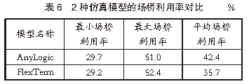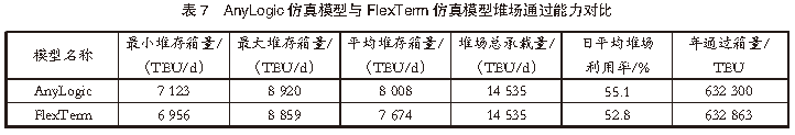 經(jīng)綜合分析發(fā)現(xiàn),無(wú)論是單一場(chǎng)橋利用率還是平均場(chǎng)橋利用率,AnyLogic仿真模型的數(shù)據(jù)結(jié)果都普遍高于FlexTerm仿真模型的數(shù)據(jù)結(jié)果。通過(guò)分析堆場(chǎng)作業(yè)系統(tǒng)仿真流程發(fā)現(xiàn),上述差異是由2種仿真模型的作業(yè)指令生成模式不同導(dǎo)致的。在相同的作業(yè)時(shí)段內(nèi),AnyLogic仿真模型的作業(yè)指令生成的作業(yè)數(shù)量要高于FlexTerm仿真模型的作業(yè)指令生成的作業(yè)數(shù)量,從而導(dǎo)致AnyLogic仿真模型的場(chǎng)橋利用率高于FlexTerm仿真模型的場(chǎng)橋利用率。根據(jù)港口提供的數(shù)據(jù),全年該港口自動(dòng)化堆場(chǎng)的場(chǎng)橋利用率在40%~60%。基于AnyLogic仿真模型和FlexTerm仿真模型仿真得到的平均場(chǎng)橋利用率分別為42.4%、35.7%。顯然,與FlexTerm仿真模型的仿真結(jié)果相比,AnyLogic仿真模型的仿真結(jié)果同實(shí)際作業(yè)數(shù)據(jù)的統(tǒng)計(jì)結(jié)果更接近。究其原因,這是由2款仿真模型的集裝箱裝卸作業(yè)指令的生成模式不同導(dǎo)致的。對(duì)堆場(chǎng)作業(yè)系統(tǒng)仿真流程分析發(fā)現(xiàn):在AnyLogic仿真模型中,集裝箱裝卸作業(yè)指令是根據(jù)港口歷史數(shù)據(jù),借助算法計(jì)算生成的,比較接近港口的實(shí)際作業(yè)數(shù)據(jù);在FlexTerm仿真模型中,集裝箱裝卸作業(yè)指令是利用軟件自帶作業(yè)計(jì)劃模塊,通過(guò)配置船期、堆場(chǎng)計(jì)劃等參數(shù)自動(dòng)生成的,與港口實(shí)際作業(yè)數(shù)據(jù)之間存在一定的差距。4.2 堆場(chǎng)使用情況對(duì)比為了合理規(guī)劃堆場(chǎng)空間資源,根據(jù)港口提供的船期、堆場(chǎng)計(jì)劃等參數(shù),對(duì)港口堆場(chǎng)的使用情況進(jìn)行仿真對(duì)比分析。AnyLogic仿真模型與FlexTerm仿真模型堆場(chǎng)通過(guò)能力對(duì)比見(jiàn)表7。由表7可知,在相同輸入條件下,AnyLogic仿真模型和FlexTerm仿真模型仿真模擬得到的堆場(chǎng)利用情況和堆場(chǎng)通過(guò)能力基本一致。但由于泊位船舶計(jì)劃較為寬松,船期密度小于實(shí)際船期數(shù)據(jù),AnyLogic仿真模型和FlexTerm仿真模型的堆場(chǎng)通過(guò)箱量分別為632 300 TEU和632 863 TEU,均小于港口全年實(shí)際堆場(chǎng)通過(guò)箱量724 272 TEU。