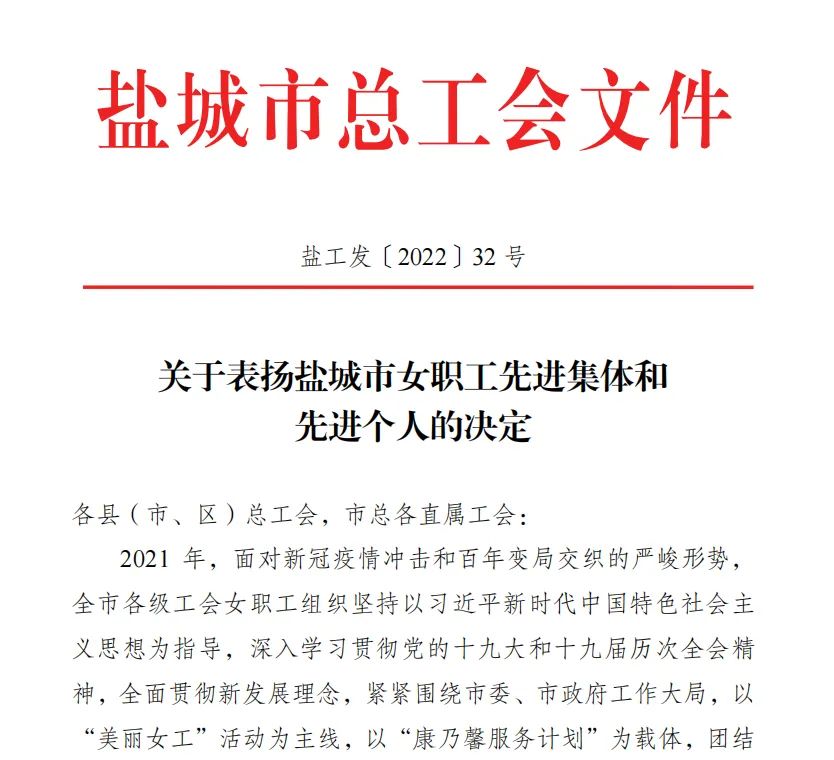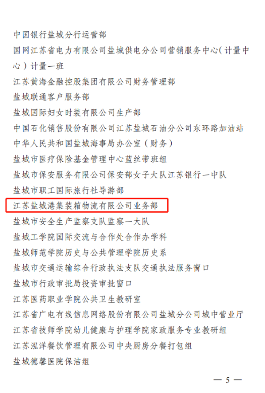 近日,市總工會發(fā)布《關(guān)于表揚鹽城市女職工先進集體和先進個人的決定》,袁欣同志、江蘇鹽城港集裝箱物流有限公司業(yè)務(wù)部,分別獲得“鹽城市五一巾幗標(biāo)兵”“鹽城市五一巾幗標(biāo)兵崗”榮譽稱號。