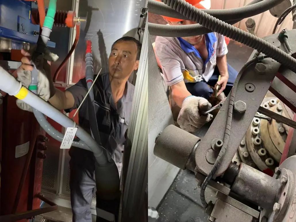天氣炎熱,設備也常“中暑”。“2#門機出現分波過熱故障,門機跳電了”,早上7點,剛到港的修理電工大宋就接到前方司機的報修指令。大宋隨即和同伴趕到現場,經過排查,發現是左旋電機風機損壞。經過2個多小時的搶修,設備再次順利投入使用。搶修人員剛下門機還沒來得及喝口涼水,對講機里又傳來了1#門機整機跳電故障報修。經檢查判定這是一起因電纜滑環內外溫差導致設備內部有水凝造成的設備故障。此時戶外的溫度已達35℃,而門機機房經過陽光的烘烤已近40℃,搶修人員卻毫不遲疑,立即投入搶修工作......