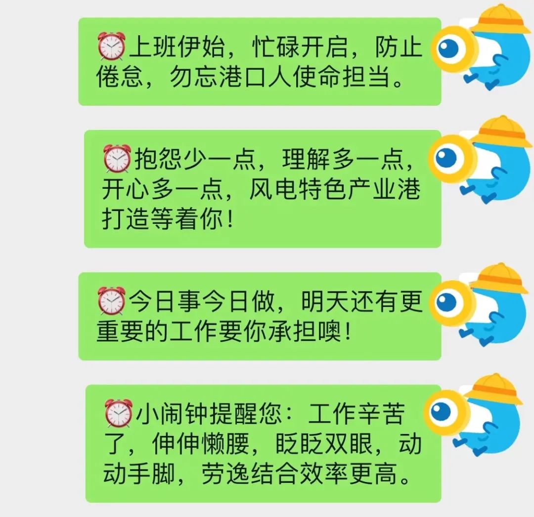 叮鈴鈴,“上班伊始,忙碌開啟,防止倦怠,勿忘港口人使命擔當?!泵刻煲簧习?,打開電腦,首先彈出上述信息。這是射陽港區新增設的辦公“鬧鐘小貼士”的管家信息。提醒各位員工,作為鹽城港人,要時刻不忘肩負的“架起鹽城走向世界海上大通道”時代使命,必須時刻保持永不懈怠、奮發拼搏的精神狀態,做好自己的本職工作。
