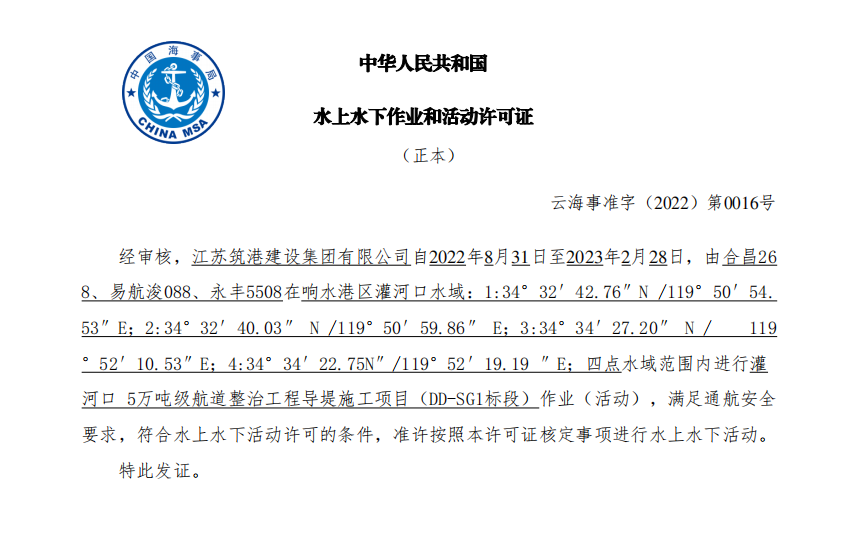 8月30日至31日,連云港海事局陸續(xù)簽發(fā)灌河口5萬噸級航道整治工程導(dǎo)堤施工一標(biāo)段和二標(biāo)段水上水下活動許可證,標(biāo)志導(dǎo)堤工程施工前手續(xù)全部完成,為灌河口5萬噸級航道整治工程的全面開展邁出了重要一步。