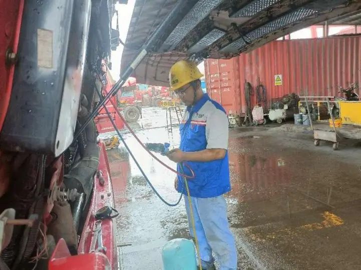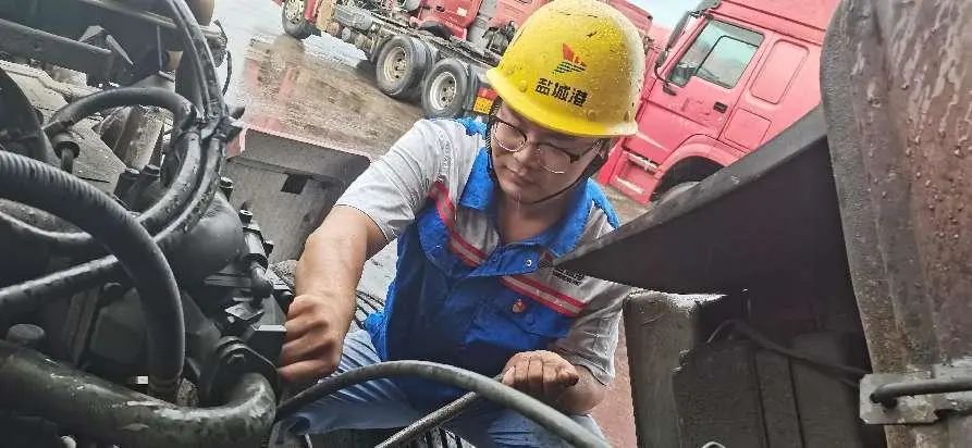 連續的高溫,讓穿梭于碼頭與堆場的車輛,也會受不住“中暑生病”,出現散熱不暢、空調不制冷、控制器高溫等故障。為保證碼頭的正常運營,陸晨不顧已超40℃的體感溫度,戴上工作手套,拿著他的工具箱,打開已達60℃的發動機,用手觸摸每一個部件來尋找“癥結”。汗水不斷滑下,工作服也因汗水而浸濕,緊緊貼在身上,但陸晨全然不顧,只一心一意、專心致志為集卡車“把脈問診”。高溫下的時間總是顯得很緩慢,陸晨擦了檫臉上的汗笑著說:“我工作10年了,剛開始也不適應,但因為喜歡車,慢慢也就習慣了。”陸晨介紹,除發動機外,在密閉駕駛室內檢修,也是一大考驗。車廂外40℃左右的高溫,駕駛室內則完全密閉,很多人是受不了的。“任何一臺集卡車都離不開我們修理工。”陸晨說,“我的任務就是盡自己最大努力修理車輛,保證碼頭的正常運轉”。