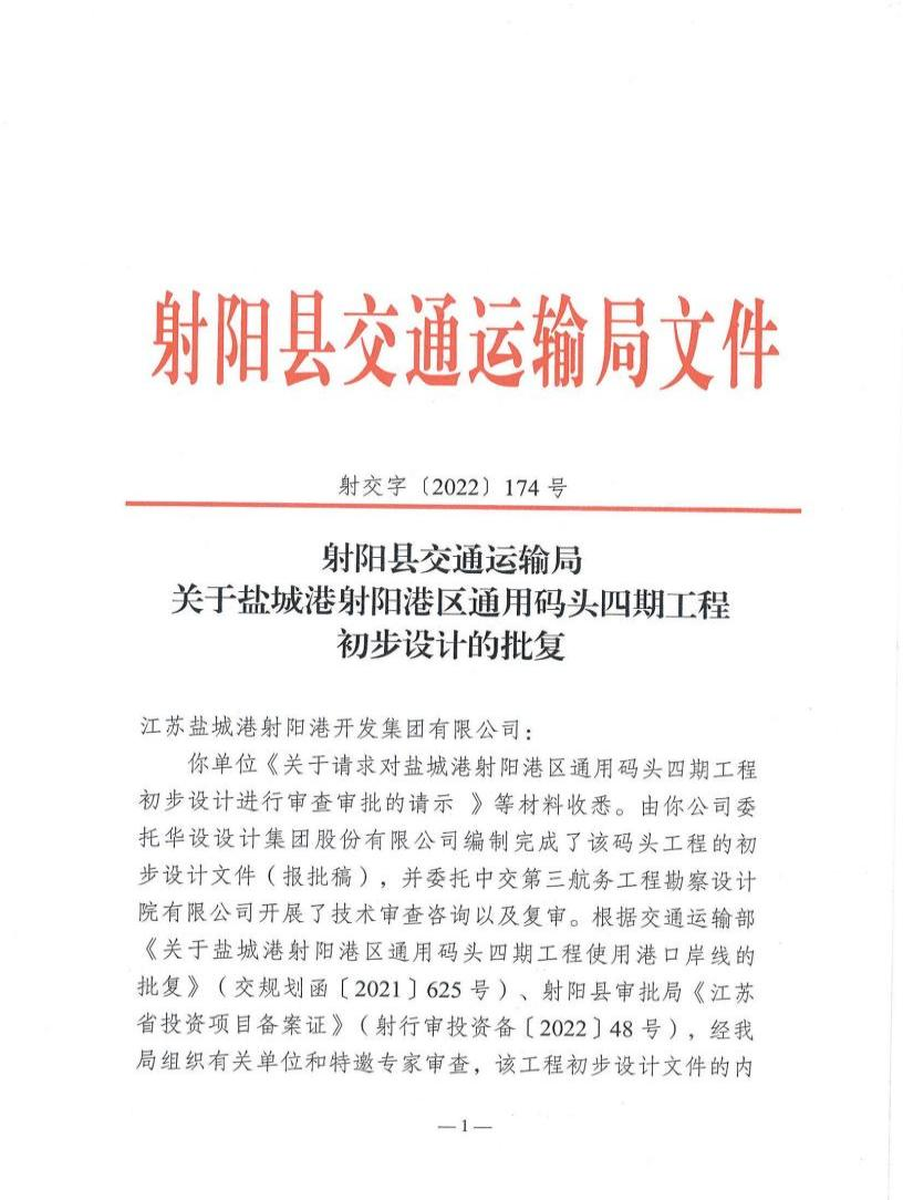 8月30日,鹽城港射陽港區(qū)通用碼頭四期工程項(xiàng)目初步設(shè)計(jì)和施工圖設(shè)計(jì)取得正式批復(fù)。至此,該項(xiàng)目已完成所有前期手續(xù),為項(xiàng)目的正式開工奠定了堅(jiān)實(shí)的基礎(chǔ)。