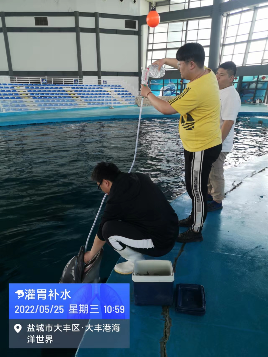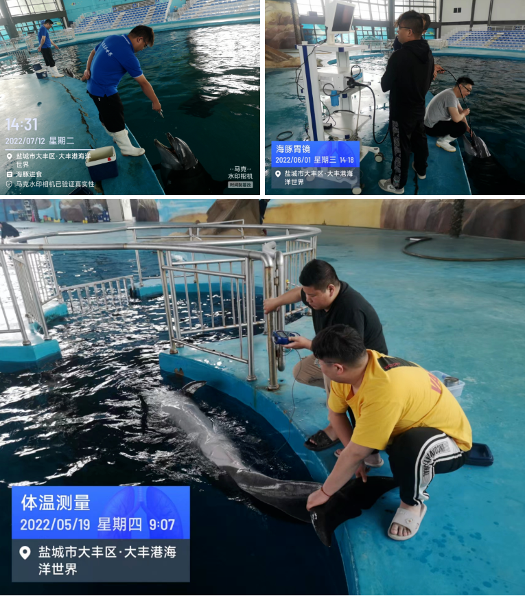 文旅集團海洋世界所飼養(yǎng)的兩頭海豚,學(xué)名日本寬吻瓶鼻海豚,他們來大豐港區(qū)已經(jīng)生活了六年多,已充分適應(yīng)了這里的環(huán)境。在我們馴養(yǎng)團隊的精心照料下,快樂地成長。馴養(yǎng)師每天精心準(zhǔn)備海豚寶寶喜愛吃的俄羅斯進口的鯡魚、日本進口的多春魚以及挪威進口的魷魚,一個海豚的日食量達到10公斤。同時每日為其補充各種維生素。我們每天檢測他們的體溫、用插胃管的方式“飲水”。正常情況下,每月為其全面體檢一次,包括采血檢驗、胃鏡檢查、呼吸空氣采樣送檢,從而確認(rèn)他們身體處于健康狀態(tài)。