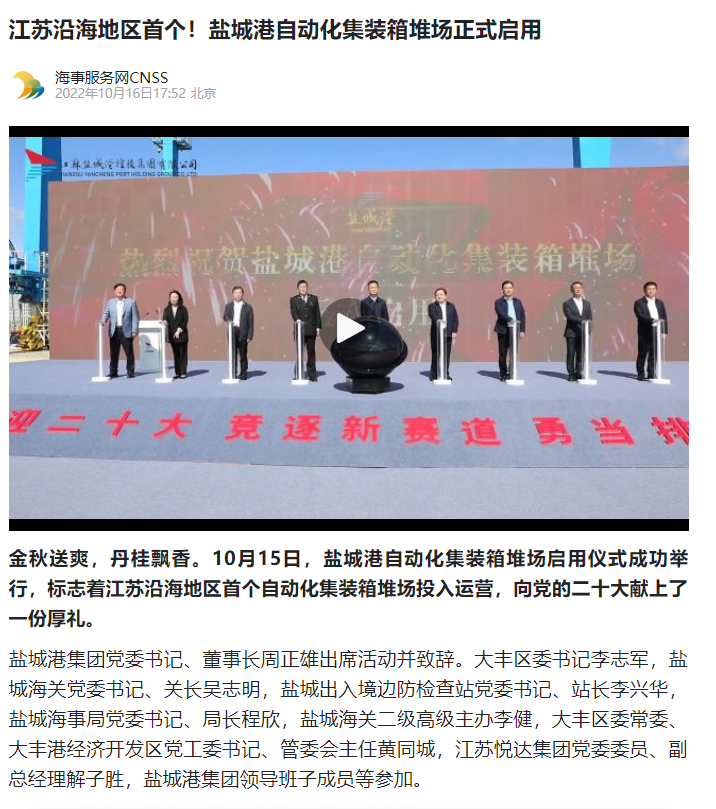 鹽城港大豐港區自動化集裝箱堆場正式啟用引發媒體廣泛關注