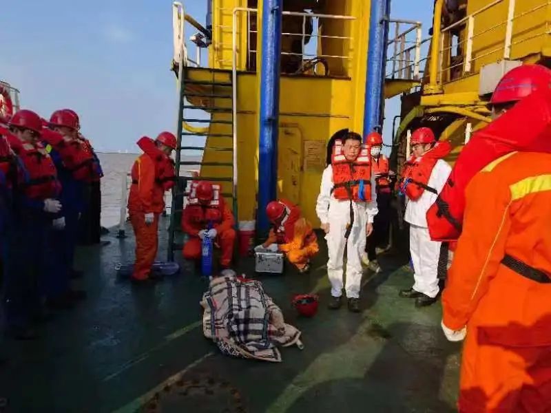 隨后進行的是人員落水演習?!皥蟾?,皮龍隊一人整理皮龍帶時不慎落水?!薄疤旎⑻枴贝L接報后立刻指令駕駛員發出有人落水警報,并通知交通船協助救援,同時向項目部、公司調度室報告人員落水情況;打撈隊將落水人員救撈上來后,救護隊采用控水、心肺復蘇等急救措施對落水人員進行模擬救助,經搶救后落水者蘇醒,船長安排相關人員將落水者送往醫院接受進一步檢查。