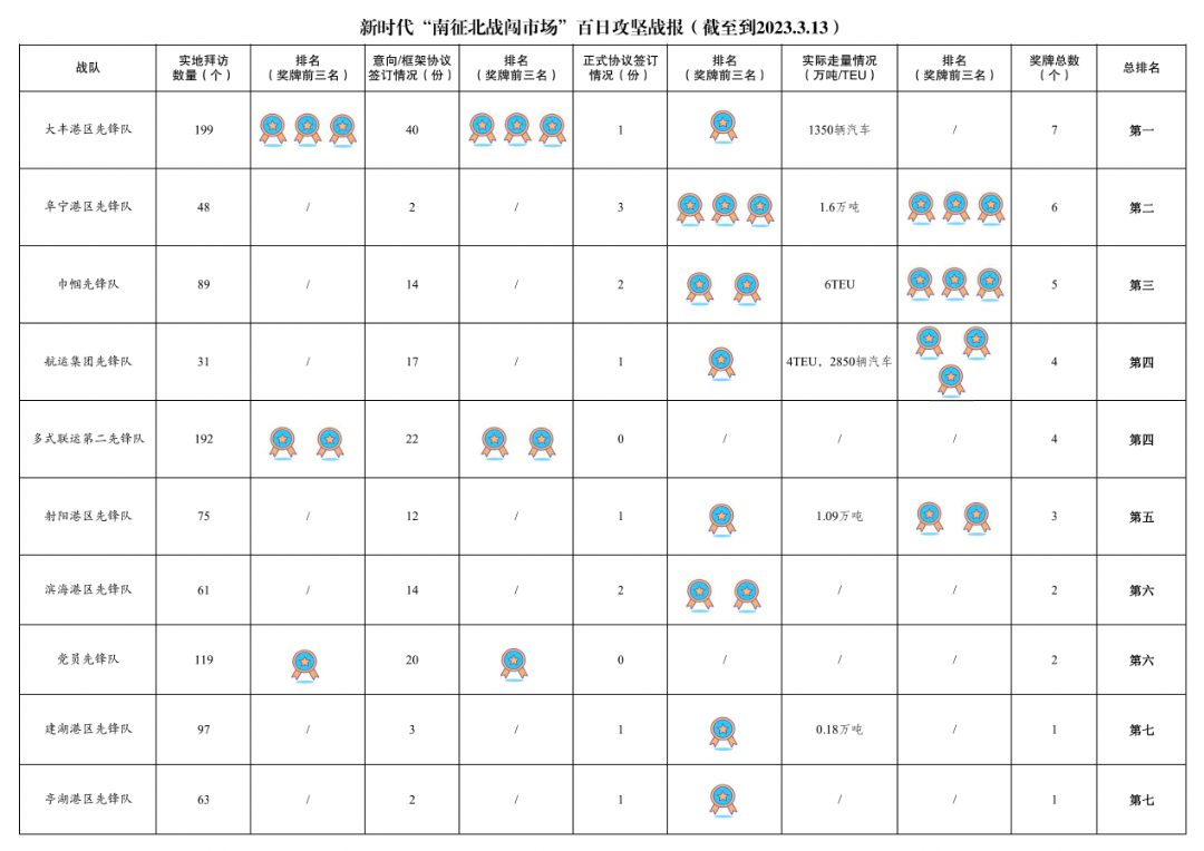 1.累計拜訪客戶數(shù)量1179家:其中大豐港區(qū)先鋒隊199家,多式聯(lián)運第二先鋒隊192家,黨員先鋒隊119家,響水港區(qū)先鋒隊99家,濱海港區(qū)先鋒隊97家,巾幗先鋒隊89家,射陽港區(qū)先鋒隊75家,亭湖港區(qū)先鋒隊63家,濱海港區(qū)先鋒隊61家,多式聯(lián)運第一先鋒隊55家,青年先鋒隊51家,阜寧港區(qū)先鋒隊48家,航運集團先鋒隊31家。