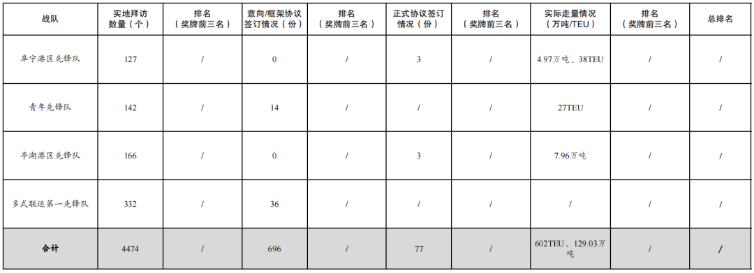 活動開展以來,累計拜訪客戶數量4474家,簽訂意向/框架協議數量696份,簽訂正式協議77份,實際走量602TEU、129.03萬噸。
