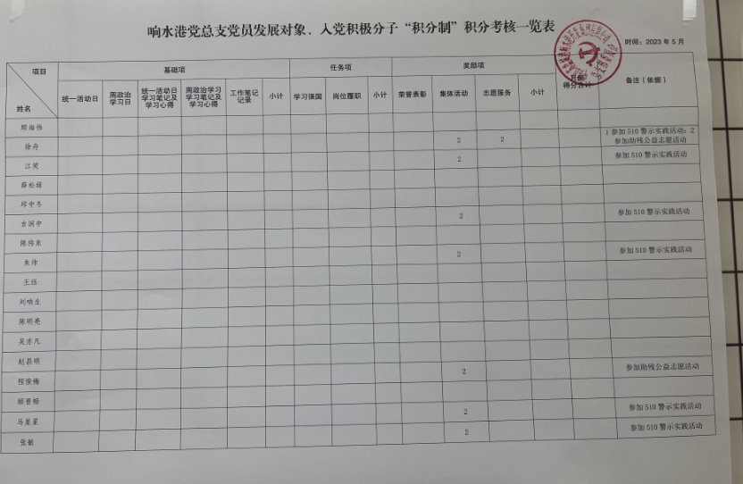 結合調研實際情況,制定《關于響水港開發集團黨員發展對象、入黨積極分子“積分制”管理考核實施辦法(試行)》,考核辦法實行年度“百分制”+N積分模式,以黨章、黨規、黨紀為基本準則,以參加“基層黨組織統一活動日”、周政治學習、學習強國、履職盡責、志愿服務等12個方面,逐類逐條量化分值,力求全方位、近距離地掌握積極分子的日常表現。截至目前,響水港區有16余名發展對象、入黨積極分子已成為第一批“質檢”對象。響水港集團黨總支通過積分管理,實現入黨積極分子管理由抽象向具體轉變,確保入黨積極分子努力有方向、實做有標準、評判有依據,從源頭上把牢黨員發展入口關,提高發展黨員工作質量的同時,為響水港區融入新賽道,勇做主力軍注入新的活力。