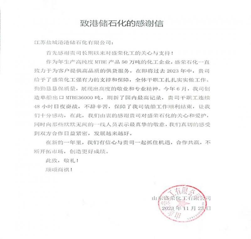 今年以來港儲石化公司全體干部職工堅持以“時間就是金錢,程序體現(xiàn)規(guī)矩,質(zhì)量鑄就精品,效率就是生命”為宗旨,不斷提升服務(wù)品質(zhì)及工作效率,獲得了客戶的贊賞與肯定。近期,合作客戶山東玉皇盛榮化工寄來一封感謝信,信中內(nèi)容充分肯定了港儲石化的服務(wù)品質(zhì),并由衷地表達了感謝。