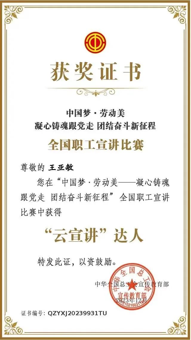 近日,中華全國總工會在廣大職工中組織開展“中國夢·勞動美一凝心鑄魂跟黨走團結奮斗新征程”全國職工宣講比賽,初賽以線上“云宣講”方式進行。集團工會聯合會有針對性地組織廣大職工參賽,迅速組織發動制作短視頻,在鼓勵廣大職工的同時,重點激勵具備一定榮譽基礎、榮獲過各級各類勞動模范、五一勞動獎章等榮譽稱號的職工,充分發揮示范帶頭作用。其中,集團大豐港區成品油水上加油站王亞敏和航運集團上港國際公司丁浩明同志榮獲中華全國總工會宣傳教育部頒發的“云宣講”達人稱號。