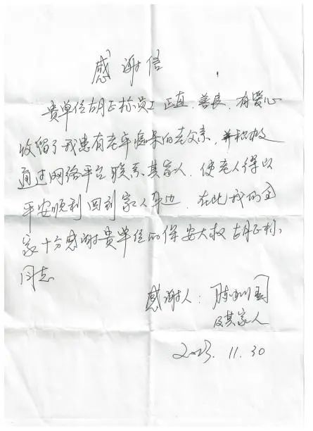 一個(gè)中午,響水港區(qū)灌江港務(wù)分公司保安隊(duì)長(zhǎng)胡正標(biāo)發(fā)現(xiàn)一位近八旬的老人在碼頭南側(cè)馬路上徘徊且沒(méi)有立即離開(kāi)跡象,便好心上前詢問(wèn)交流。該位老人冬日里衣著單薄且神志有些不清,問(wèn)其姓名、家庭住址等信息,老人都言語(yǔ)不佳,回答不出來(lái),且身上沒(méi)有任何證件或物件能證明其身份的。于是胡隊(duì)長(zhǎng)將其邀請(qǐng)至保安室內(nèi)暖和休息,為他送上熱茶和充饑食物,熱情安撫老人情緒。隨后胡隊(duì)長(zhǎng)撥通報(bào)警電話,并將老人照片發(fā)到附近周圍社區(qū)微信群中,很快群內(nèi)有位社區(qū)居民認(rèn)出該位老人。最終在社區(qū)居民的幫助下,聯(lián)系上了老人家屬。在半小時(shí)后,老人家屬趕到碼頭接到老人平安回家。在與老人家屬交談中得知,該老人從當(dāng)日早上出門便遲遲未歸家,家人一直在焦急尋找中。針對(duì)胡正標(biāo)隊(duì)長(zhǎng)的熱心行為,老人家屬萬(wàn)分感謝。冬日里的這份愛(ài)心行為,暖心又暖情,讓這個(gè)寒冷的冬日有了暖陽(yáng)般的溫馨。