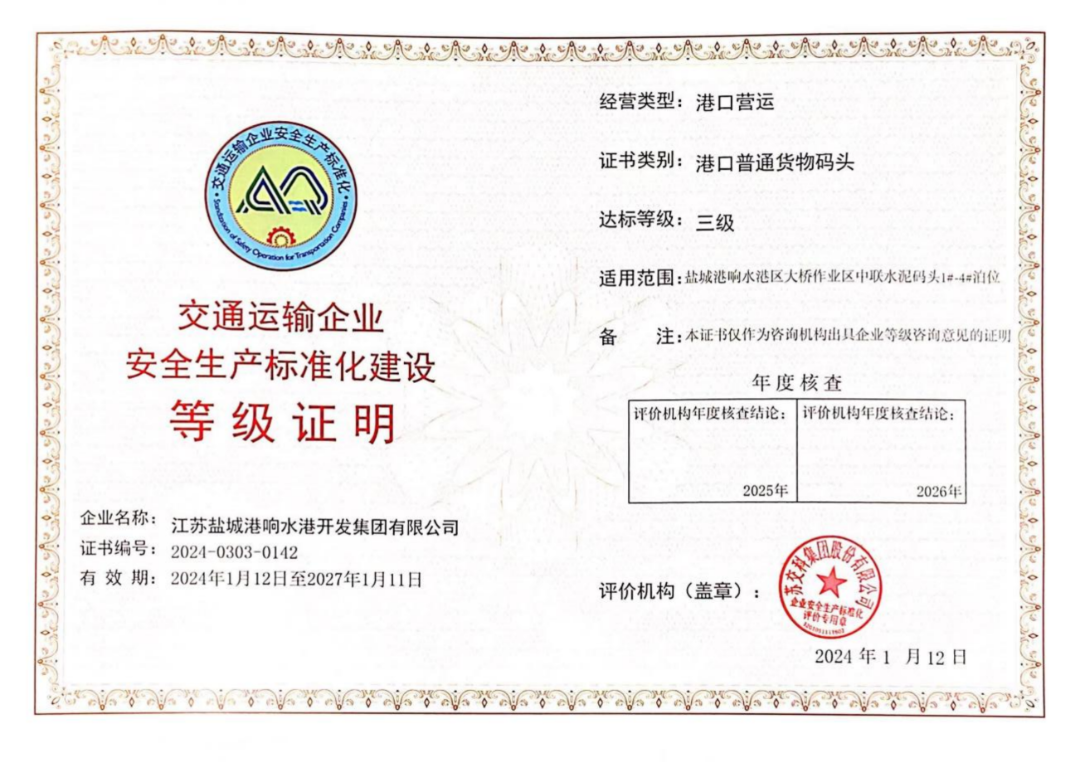 近日,鹽城港響水港區(qū)灌江港務(wù)分公司順利通過交通運輸企業(yè)安全生產(chǎn)標(biāo)準(zhǔn)化認(rèn)證考核,并取得“交通運輸企業(yè)安全生產(chǎn)標(biāo)準(zhǔn)化建設(shè)三級證書”,標(biāo)志著響水港區(qū)灌江港務(wù)分公司安全生產(chǎn)管理工作邁上新臺階。