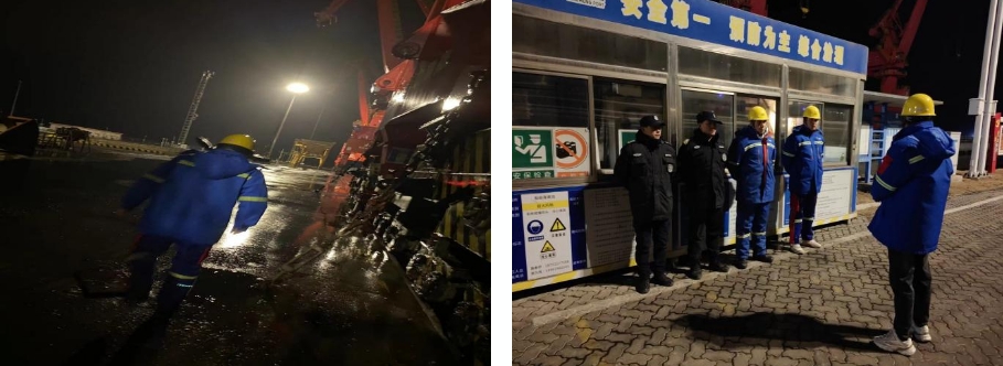 是班組長、是設備保障員,也是黨員。“我是黨員我先上”是我們每個人的行為準則。寒潮來臨前,他們仔細檢查門機錨定插板、防風拉鎖、防爬器、鐵楔是否完全插入槽內;利用加桿檢查鏈條連接環(huán)是否受力至最大值;嚴格檢測防爬器是否落地牢靠;確保惡劣天氣下港區(qū)安全有序。