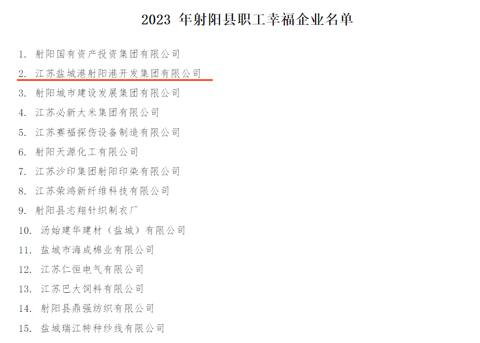 近日,射陽縣總工會(huì)公示了2023年射陽縣“職工幸福企業(yè)”名單、縣工會(huì)工作爭(zhēng)先創(chuàng)優(yōu)綜合考核結(jié)果,射陽港開發(fā)集團(tuán)榜上有名,再獲新榮譽(yù)。