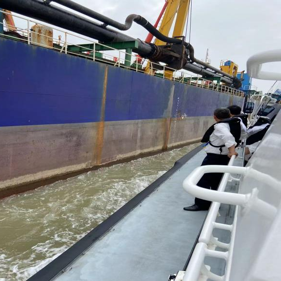 (艇作“的盧”飛快,技如“霹靂”炫睛,引航艇拉著引航員趕往巨輪所在)