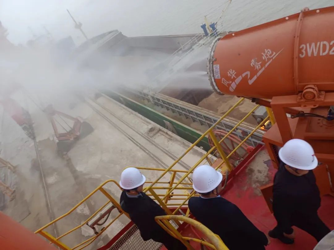在碼頭散貨裝卸過程中實施全程水霧抑塵與作業噴淋管理;散貨堆場堆碼嚴格做到全面、及時苫蓋;明確運輸車輛封閉性、貨物苫蓋、裝貨高度以及車輪沖洗等規定;港區內道路全天保證完整濕式清掃4次以上,白天實行不間斷灑水。確保在“生產性”揚塵形成初期,編織起一張“立體防護網”。