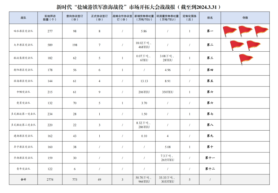 2.簽訂意向協(xié)議數(shù)量773份:其中大豐港區(qū)突擊隊(duì)198份,響水港區(qū)突擊隊(duì)98份,黨員突擊隊(duì)70份,航運(yùn)集團(tuán)突擊隊(duì)62份,巾幗突擊隊(duì)61份,濱海港區(qū)突擊隊(duì)61份,射陽(yáng)港區(qū)突擊隊(duì)56份,建湖港區(qū)突擊隊(duì)43份,阜寧港區(qū)突擊隊(duì)38份,亭湖港區(qū)突擊隊(duì)30份,多式聯(lián)運(yùn)第一突擊隊(duì)28份,多式聯(lián)運(yùn)第二突擊隊(duì)22份,青年突擊隊(duì)6份。