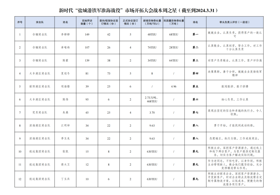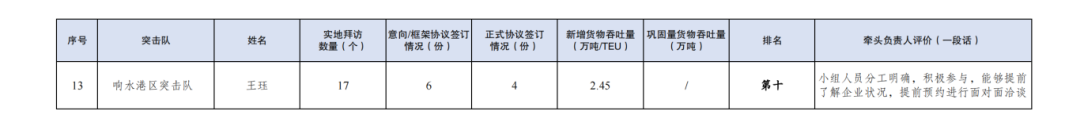 第一名:巾幗突擊隊(duì) 李婷婷(拜訪客戶(hù)149家,簽訂意向協(xié)議42份,簽訂正式協(xié)議5份,新增貨物吞吐量48TEU,鞏固量貨物吞吐量68TEU)