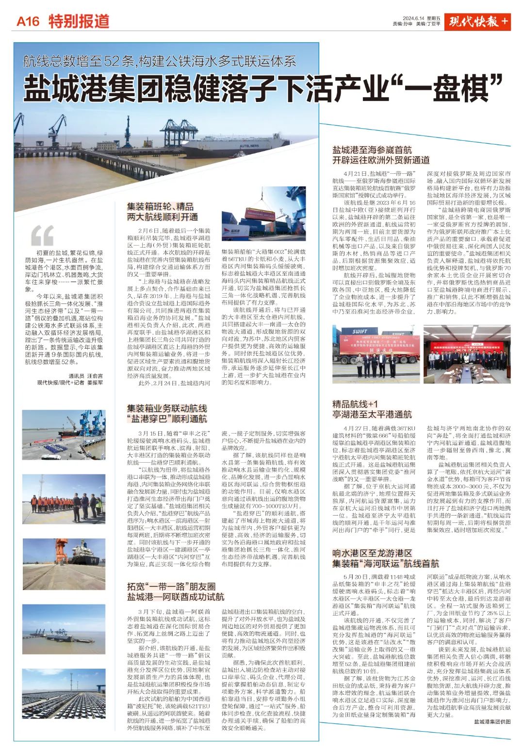 該航線是繼2023年6月16日鹽城中歐(亞)接續班列開行以來,鹽城港開辟的第二條運往歐洲的外貿新通道,航線運營初期為兩周一班,目前主要貨源為汽車零配件、生活日用品、柴油機械等出口產品,以及來自俄羅斯的木材、熱銷商品等進口產品,后期根據貨源集聚效應,適時增加班次密度。